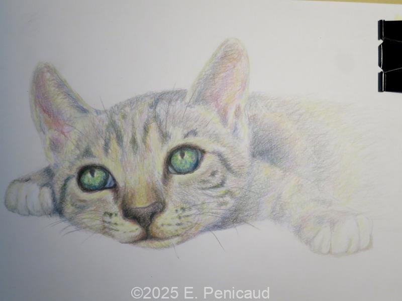 Sur mon carnet à dessin, cela fait quelques semaines où je travaille par touches sur ce petit dessin de chat aux crayons de couleurs.