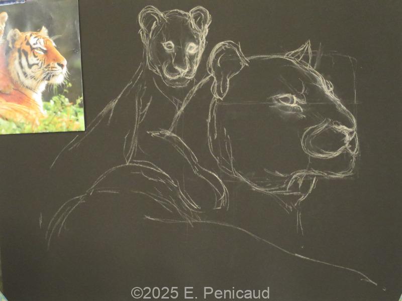 Après m’être exercé sur un carnet à dessin, j’ai réalisé un tracé préliminaire au crayon pastel sur une Pastelcard noire.