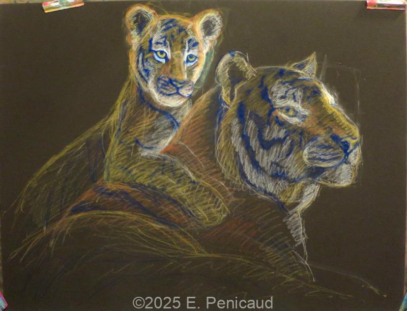 J’ai sorti mes crayons pastels et ai commencé à travailler le pelage du chat de droite.